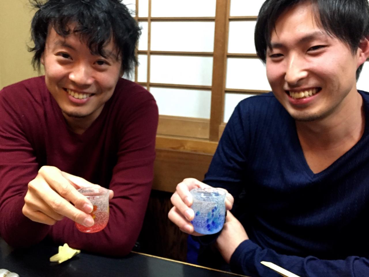 院長は赤色、谷井先生は青色と服の色と同じ色のお猪口を選ばれていました。